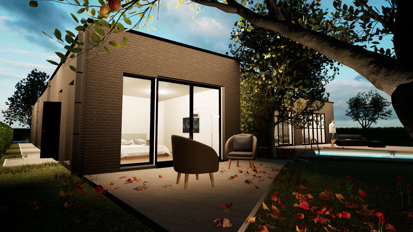 Ce concept guide le design de la maison, avec des volumes simples et épurés qui suivent ces lignes directrices. Les matériaux, tels que les briques et le bardage imitation bois, renforcent cette lecture architecturale. L’intérieur est lumineux et fluide, organisé autour d’un patio central avec des vues sur le jardin. Ce projet répond aux besoins de confort moderne et d'efficacité énergétique, tout en s'intégrant harmonieusement dans le paysage, créant ainsi une véritable continuité visuelle entre le bâti et la nature environnante.